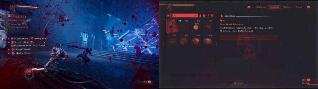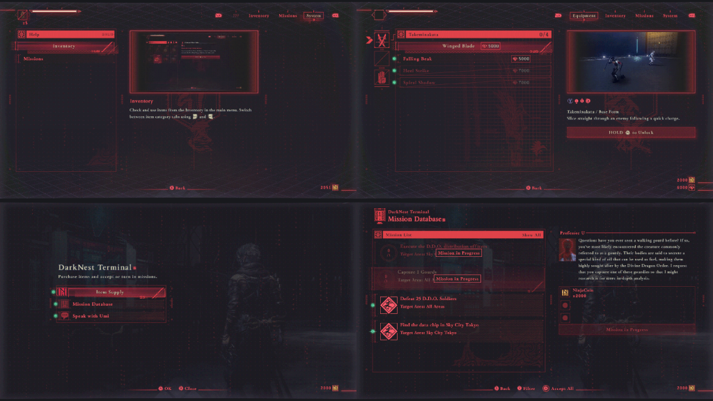 The UI concept for this title is, put simply, a “sci-fi ninja interface.” Since we had been exploring the theme of a cyberpunk feel from the beginning of development, we wanted to ensure that the UI fit that world setting. Although the game itself doesn’t dive into this aspect in detail, we wanted to create a design that would feel natural in the context of the world.