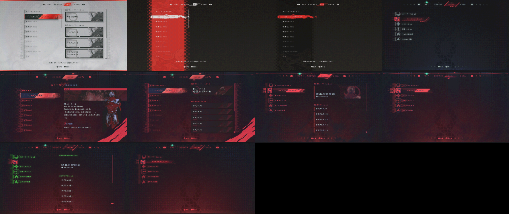We utilized Japanese text designs frequently within the menus to convey the image of a device coded in Japanese. The flowing decorations above and below overlap with the game’s rain theme, creating the impression of rain flowing across the menu screens.