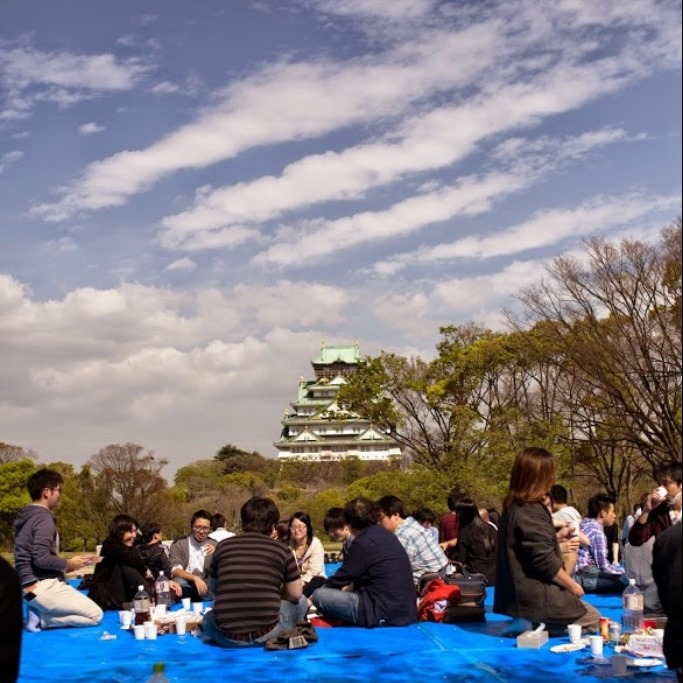 Our yearly flower-viewing party got postponed due to rain, so we didn’t get to enjoy the cherry blossoms in full bloom, but we had a great time under the beautiful new green leaves at Osaka Castle Park!